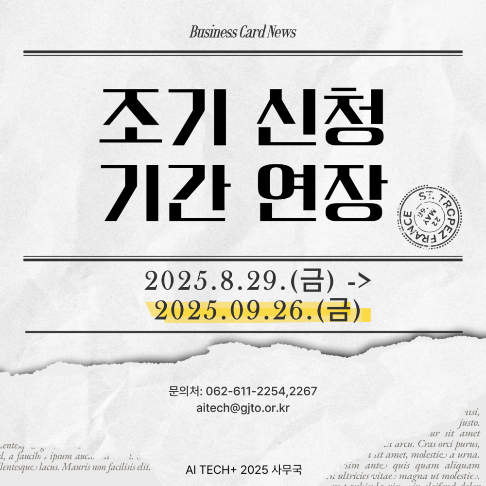 Global AI Tech Market AI TECH+ 미디어센터 공지사항 뉴스 [AI TECH+ 2025] 조기신청 기간 연장(~9.26.까지) 2025-08-28 첨부파일 조기신청.png : 안녕하세요.AI TECH+ 운영 사무국 입니다. 조기신청 기간을 9월 26일(금)까지 연장 하오니많은 참여 부탁드립니다. < 이전글 [뉴스레터 3호] AI TECH+ 전시 주요 라인업 전격 공개 ⸝⸝⸝◟̆◞̆♡ 목록 위로